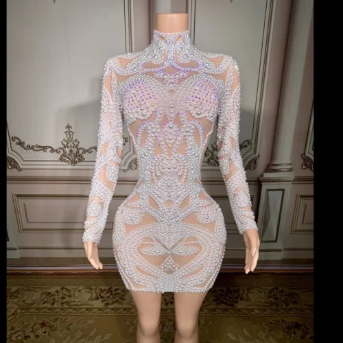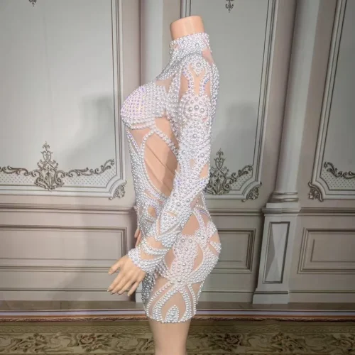 WY28 Pearl Mesh Half High Collar Tight Ultra Short Dress Mini