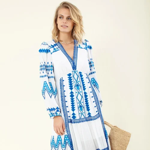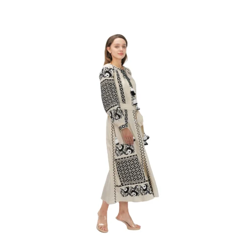 Casual Floral Embroidered Linen Dress for Women New Fashion Long Dress with Natural Waistline 100% Washable Linen