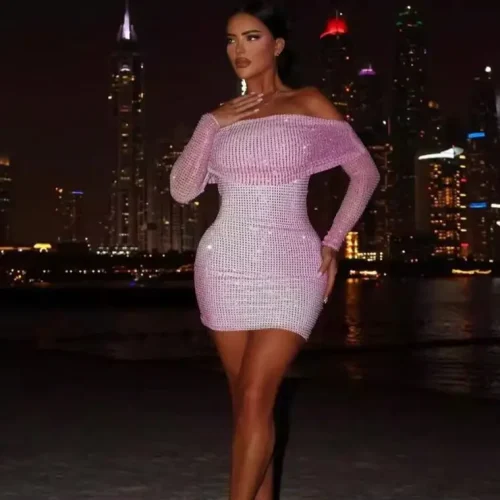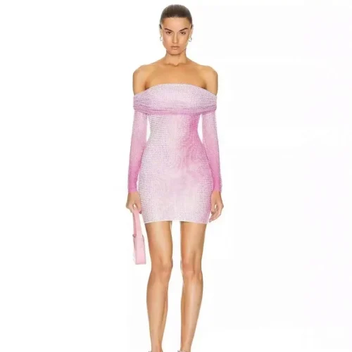 Cross-Border Independent Station Spring Rhinestone Pink Gradient Off-Shoulder Off-Neck Dress Sweetheart Party Dress