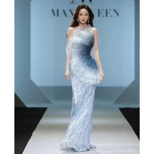 Evening Dress Women’s, Blue Dinner Party Show Host Waist-Tight Fishtail Sequins Bridesmaid Wedding Dress