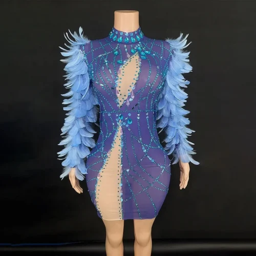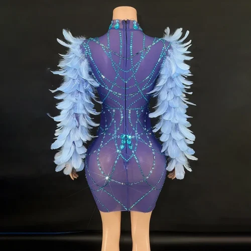 Luxury Evening Dresses Sexy Hollow Gorgeous Feather Sleeves Blue Sequin Dress Party Evening Performance Dress
