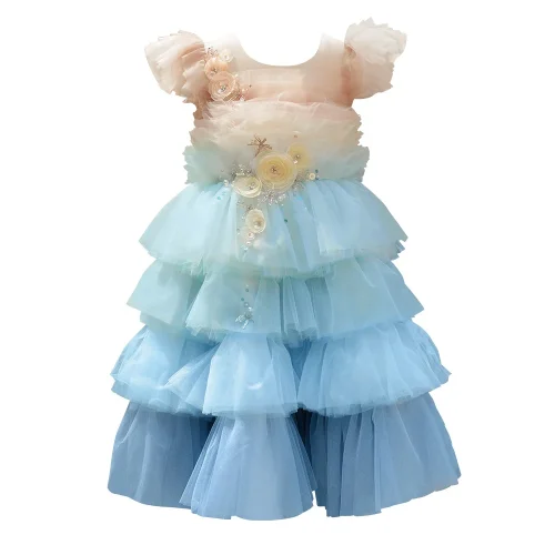 Multilayer 3D Flower Beaded Tulle Dress for Baby Girls Blue Ocean with Short Sleeves Princess Style Muriel Dress for Parties