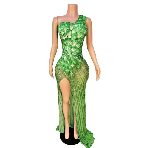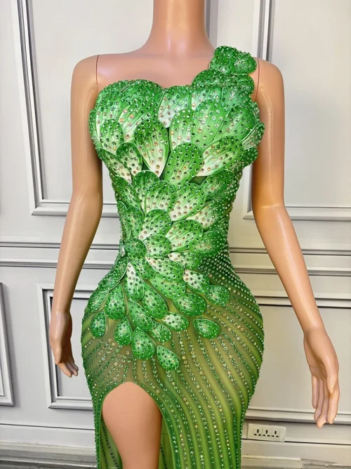 New Green Mesh See Through Flower Evening Dresses Rhinestone Birthday Dress Plus Size Women’s Clothing