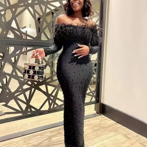 New Arrived 2534 Elegant Women Clothing Luxury Evening Drees Feather Elegant Dresses for Women Party Sequins
