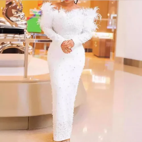 New Fashion Feather Long Sleeve Dresses Slim Tight Nail Bead White Party Dress Evening Dresses