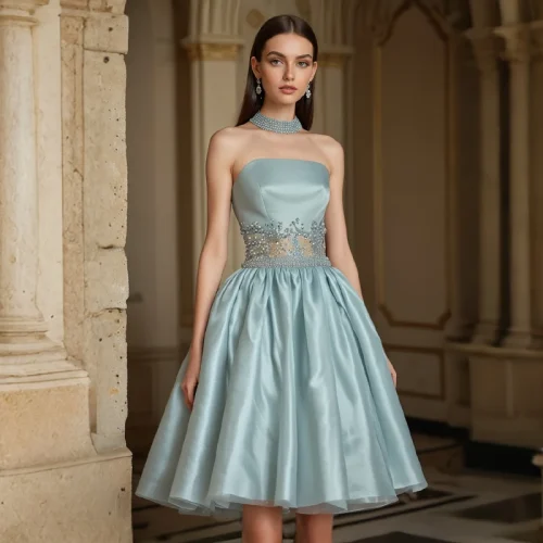 ZYHT 73060 Elegant Blue Diamond Beaded Applique Panel Satin Knee Length Strapless Dress for Ladies A-Line Evening Party Dress