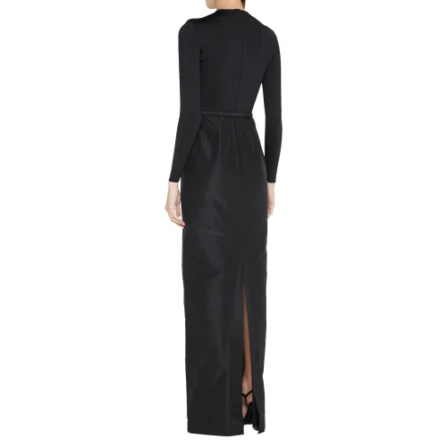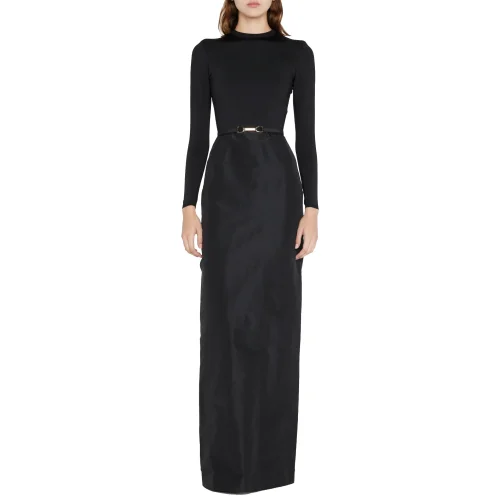 Black Full Length Column Belted Round Neck Long Sleeve Gown Evening Dresses