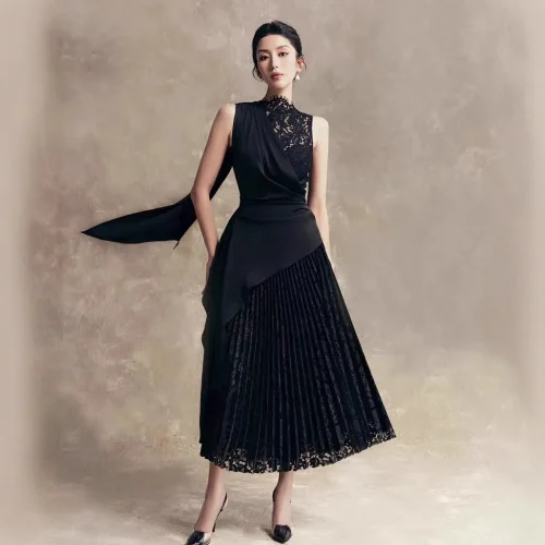Boutique 2025 High Quality Elegant Black Slim Women Dress round Neck Lace Pleated Patchwork Long Evening Dress