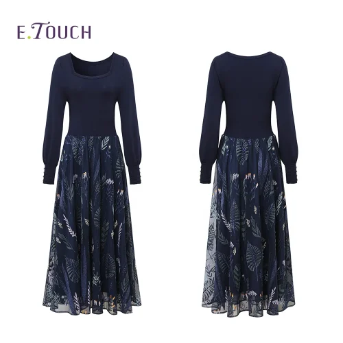 Autumn and Winter New Long Sleeve Square Neck Temperament Knitted Splice Fashion Blue Embroidered Slim Fit Dress