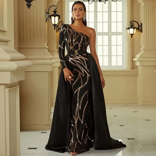 Asymmetrical Sequin Evening Dresses Elegant One Shoulder Fashion Women’s Clothing High Waist Floor-length Formal Party Dress