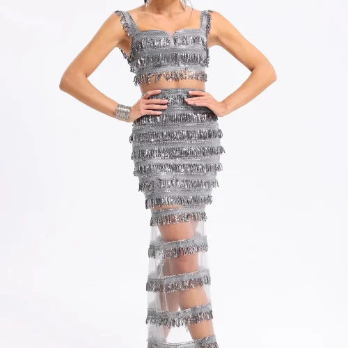BEISHI Women Fashion Sleeveless Silver Sequins Tassel Dress Sexy Elegant Bodycon Cocktail Club Evening Party Wear Dresses