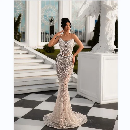 A8557 Elegant Gorgeous Prom Evening Dress Off Shoulder Dress Beaded Chain Slim Mermaid Wedding Women Maxi Dress