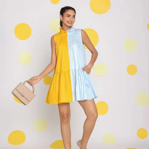 100% Cotton Mini Dress Yellow and Ice Blue Relaxed Dress Cotton Short and Mini Summer Short Fitted Dress Available Big Size