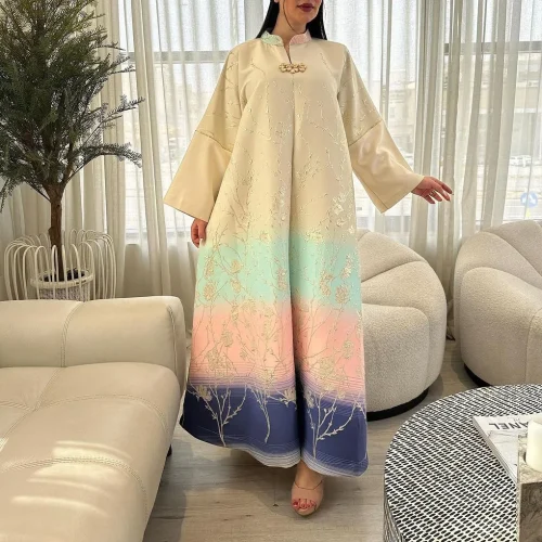 1367 Trendy Women Maxi Gowns Eid Floral Abaya Long Sleeve Modest Dresses for Women Kaftan Maxi Dresses Islamic Casual Dress