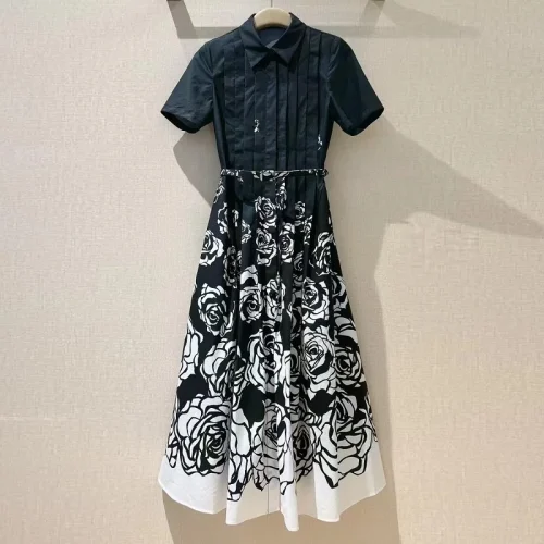 100%Cotton Long Dress 2025 Spring Women Turn-down Collar Vintage Floral Prints Pleated Patchwork Short Sleeve Black Maxi Dress