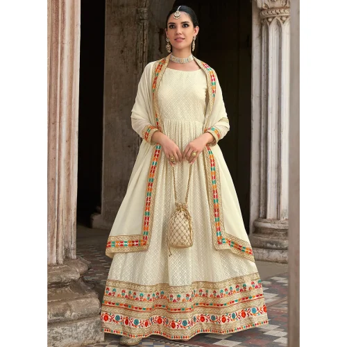 Cream Embroidery Work Georgette Anarkali Suit Traditional Regional Clothing