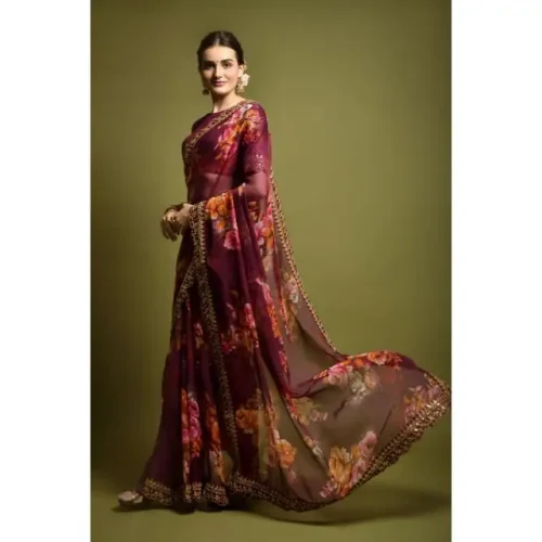 Designer Georgette Floral Print Saree Handmade Blouse High Work Quality Bulk Wine Saree for Adults’ Daily Wear Indian Pakistani