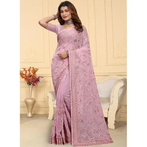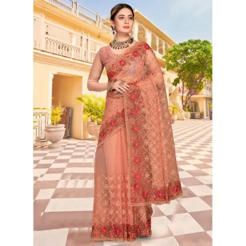 Dusty Peach Resham Work Net Trendy Saree Modest Wedding Dress