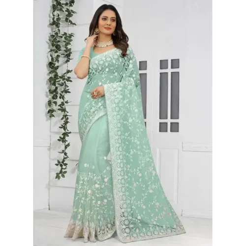 Dusty Sky Resham Work Net Saree Modest Evening Dress