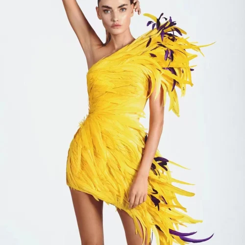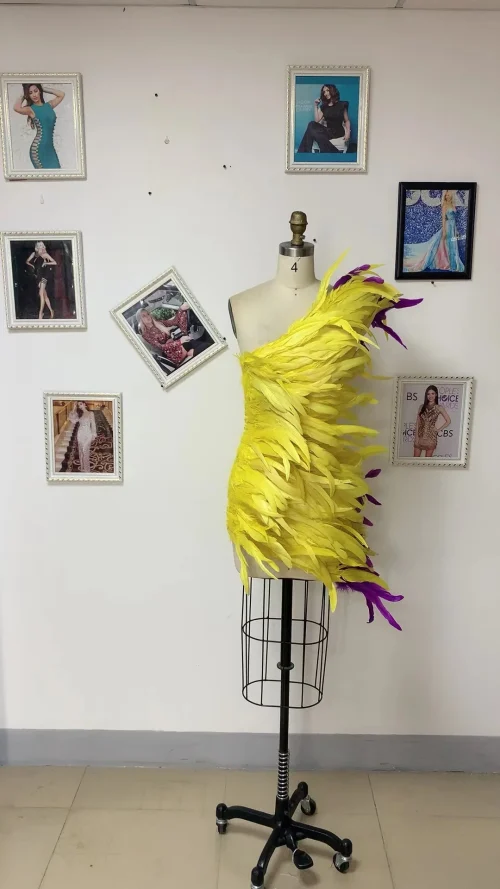 ED2168 Sexy Evening Dress Stage & Dance Wear Yellow Real Feather Women Clothing Prom Dresses With Feathers