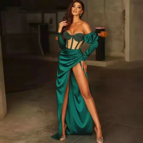 ED2108 Woman Clothing Elegant Mint Long Dress With Beads Satin Dress Women Silk Sexy Dresses Club