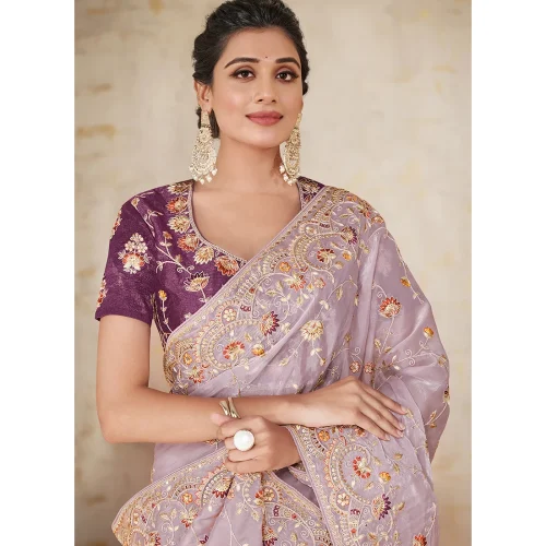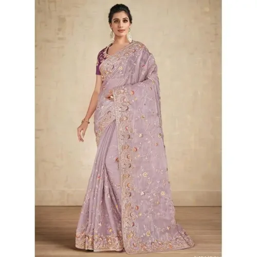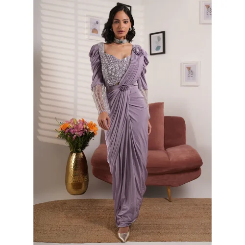 Lavender Embroidery Work Lycra Saree Wedding Ready-to-Wear Evening Dress
