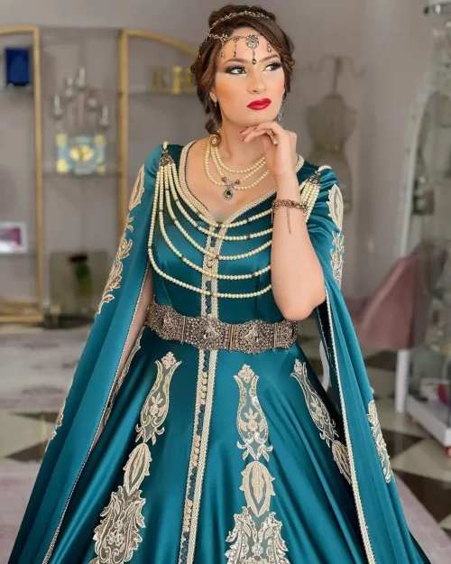 Luxury Satin Evening Dresses Fashion Bead Bridal Dress Caftan Lace Hand Work Floor-length Gown Moroccan A Line Robe