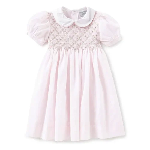 Little Girls Vintage 100% Cotton Solid Color Short Sleeve Peter Pan Collar Midi Dress Twirl Smocked Dresses for Kids