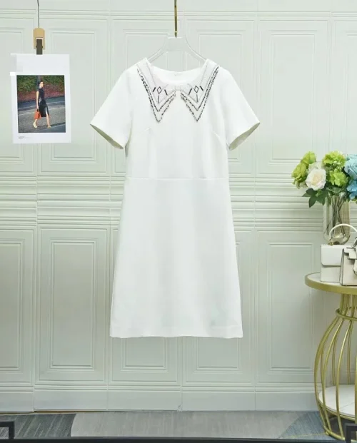 Luxury Dress 2024 Summer Party Women Hand Made Beading Tassel Deco Short Sleeve Straight Elegant Black White Dress Office Lady