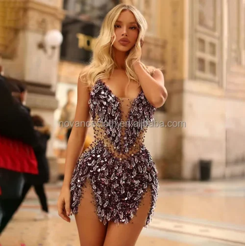 Nocance Novance Bulk Women’S Clothes Diamond Tassel Shinny Ladies Purple Dress Short Formal Dress Elegant for Women
