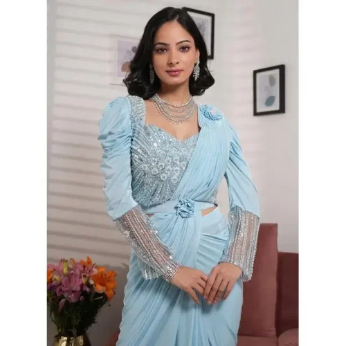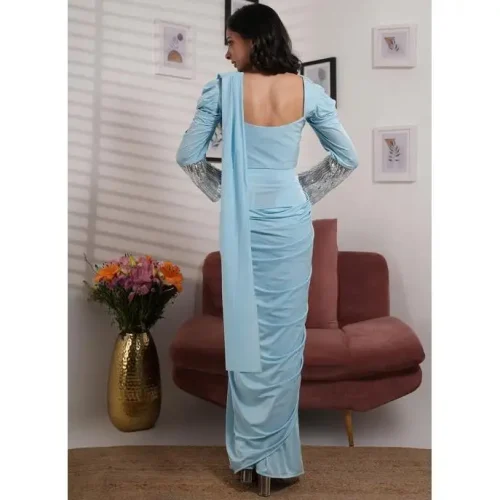 Sky Blue Embroidery Work Lycra Saree Wedding Wear Ready to Wear Dress