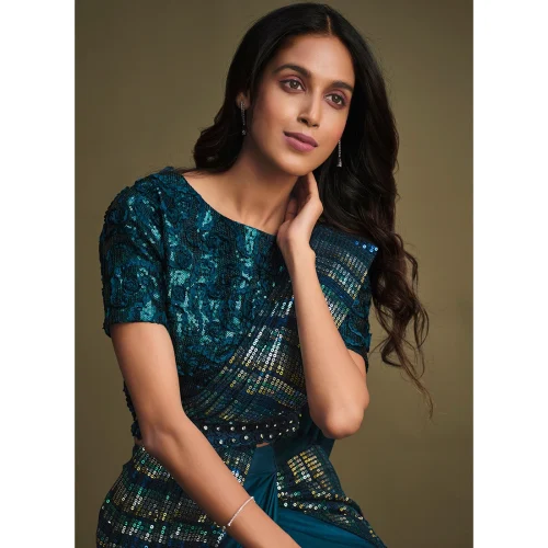 Teal Sequins Crystal Silk Saree Ready to Wear Party Dress for Work or Clubbing