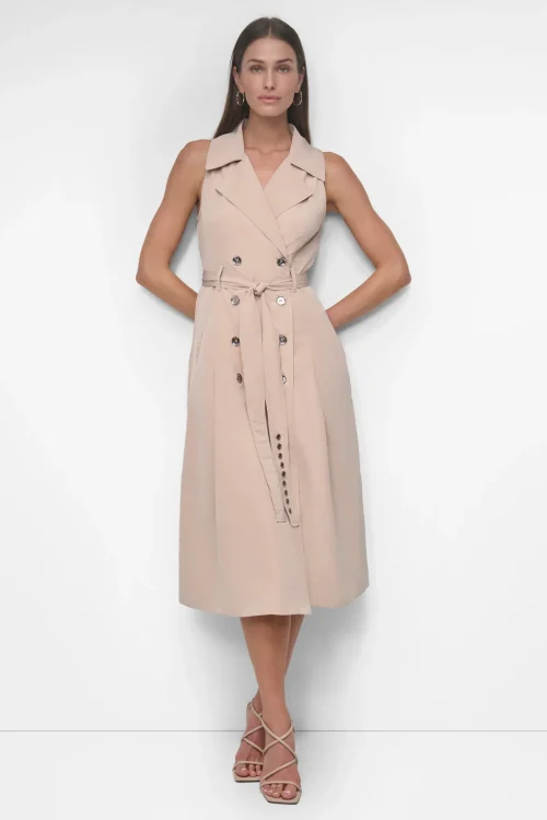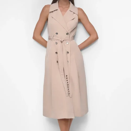 Summer Taffeta Cotton Sleeveless Mid-length Dresses Casual Button Decoration Belt Dresses Work Women Clothing
