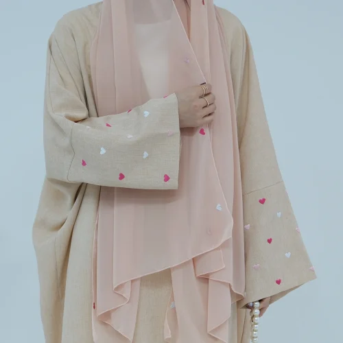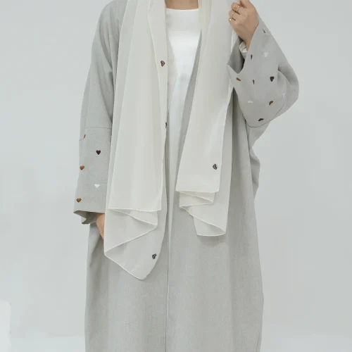316 Cotton Linen Front Open Heart Embroidered Long Sleeve Kimono Cardigan Hijab Abaya Dress for Muslim Women