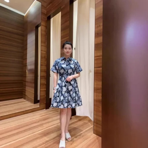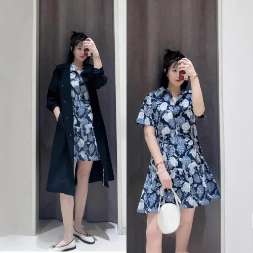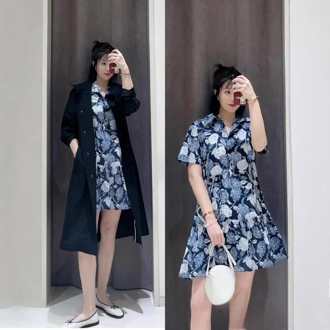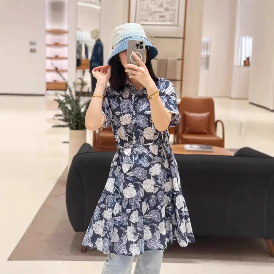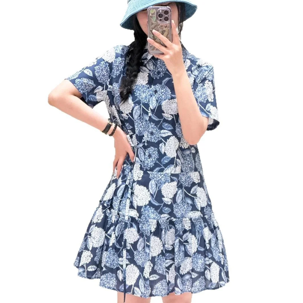 Product Name: 100% Cotton Floral Pattern Dress Stock IC 2025 Turn-Down Collar Short Sleeve Mid-Length Anti-Wrinkle for Casual Dress