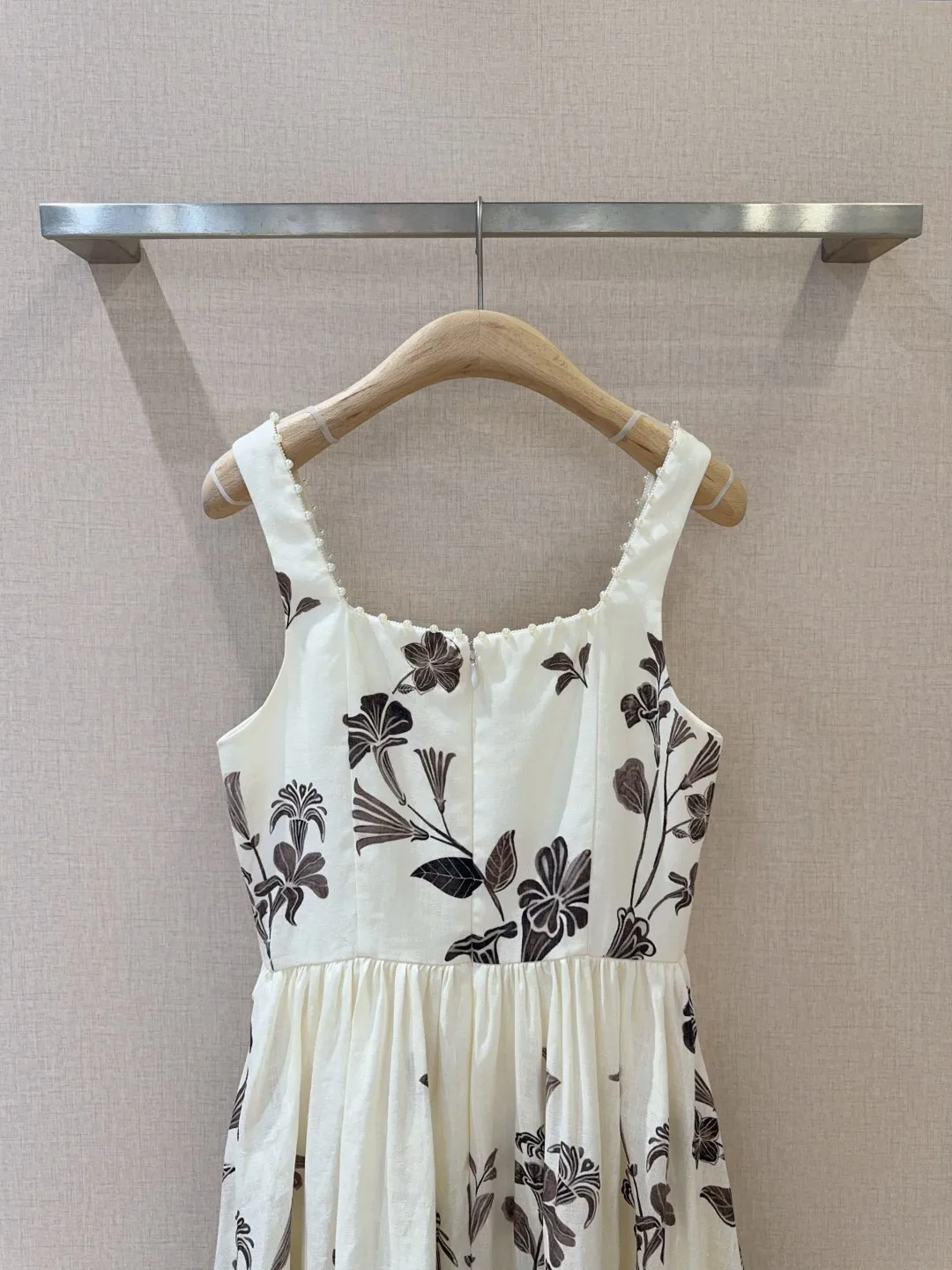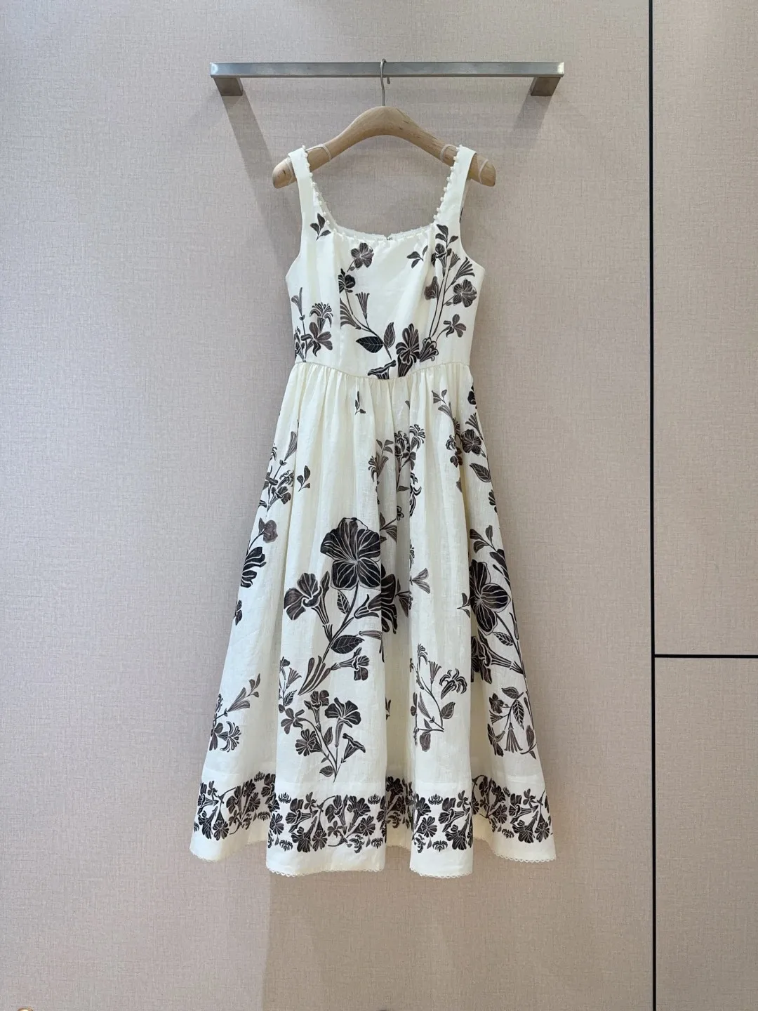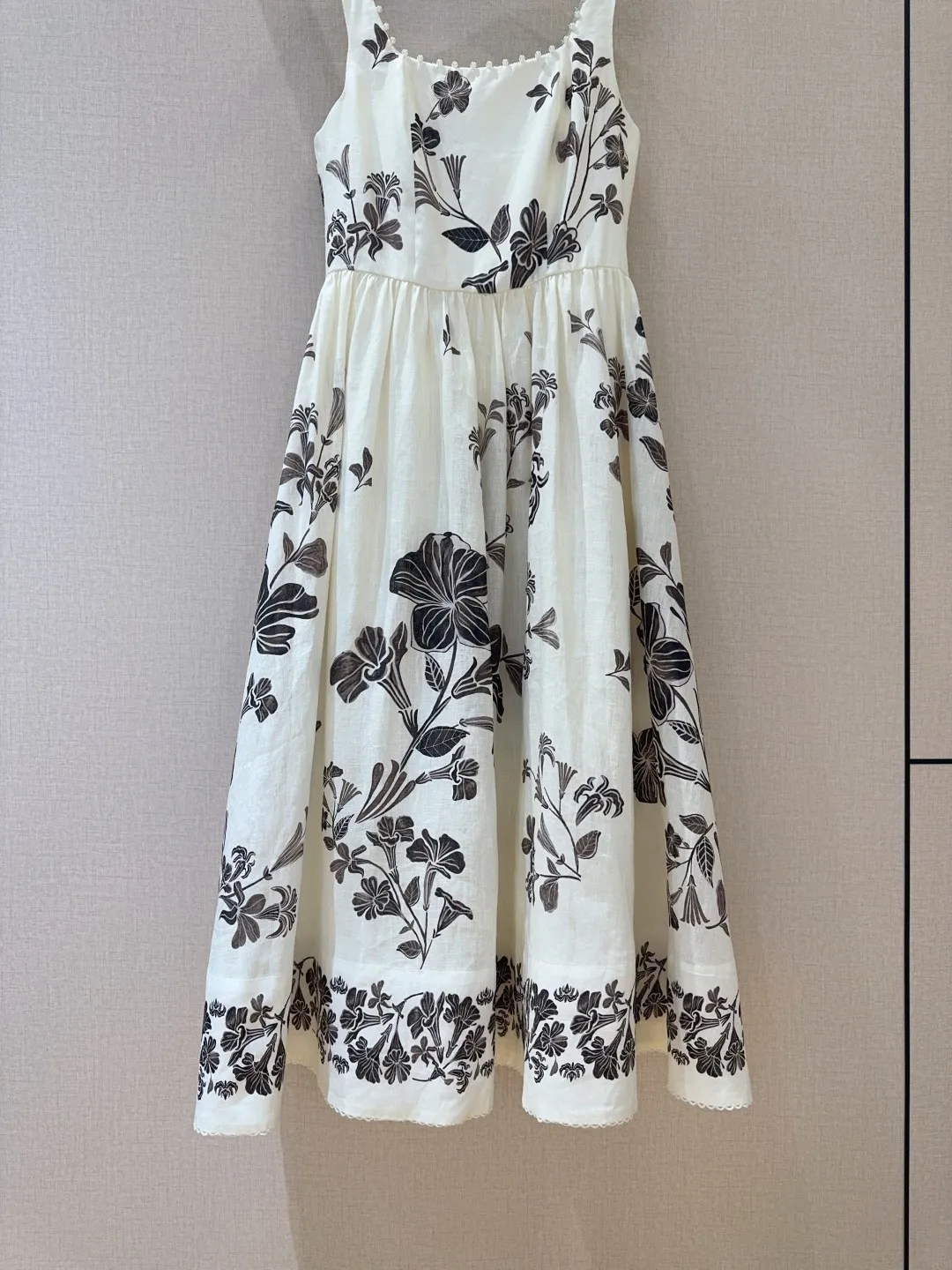Product Name: 100% Linen Dress Summer Spring New Fashion Design Women Runway High Quality Vintage Flower Print Beading Casual