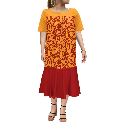 Product Name: 10036-T- Mumu Muumuu Hawaiian Flower Print Square Collar Micronesian Dress Plus Size Womens Fishtail Dress