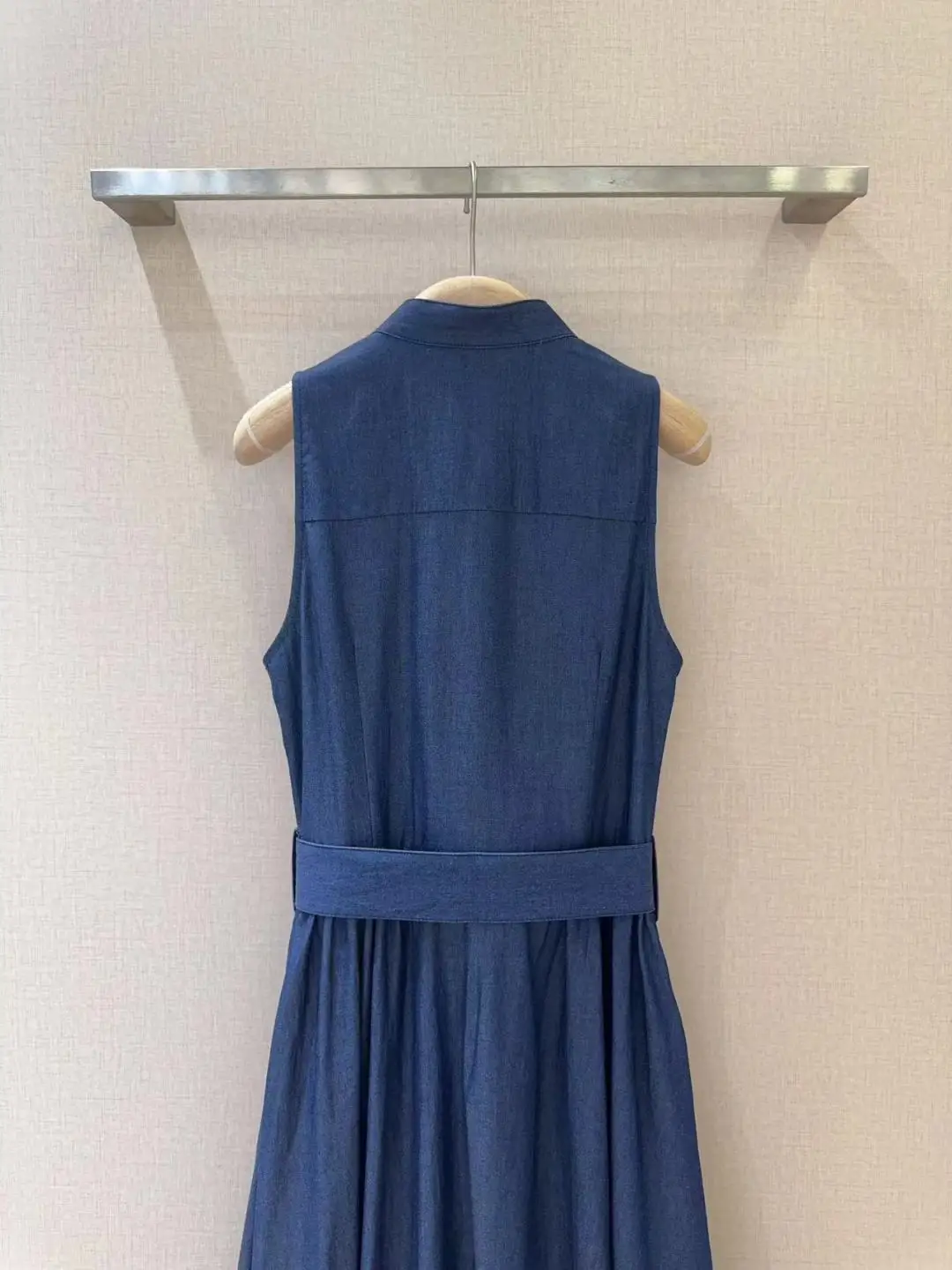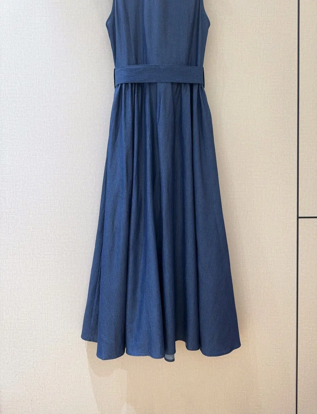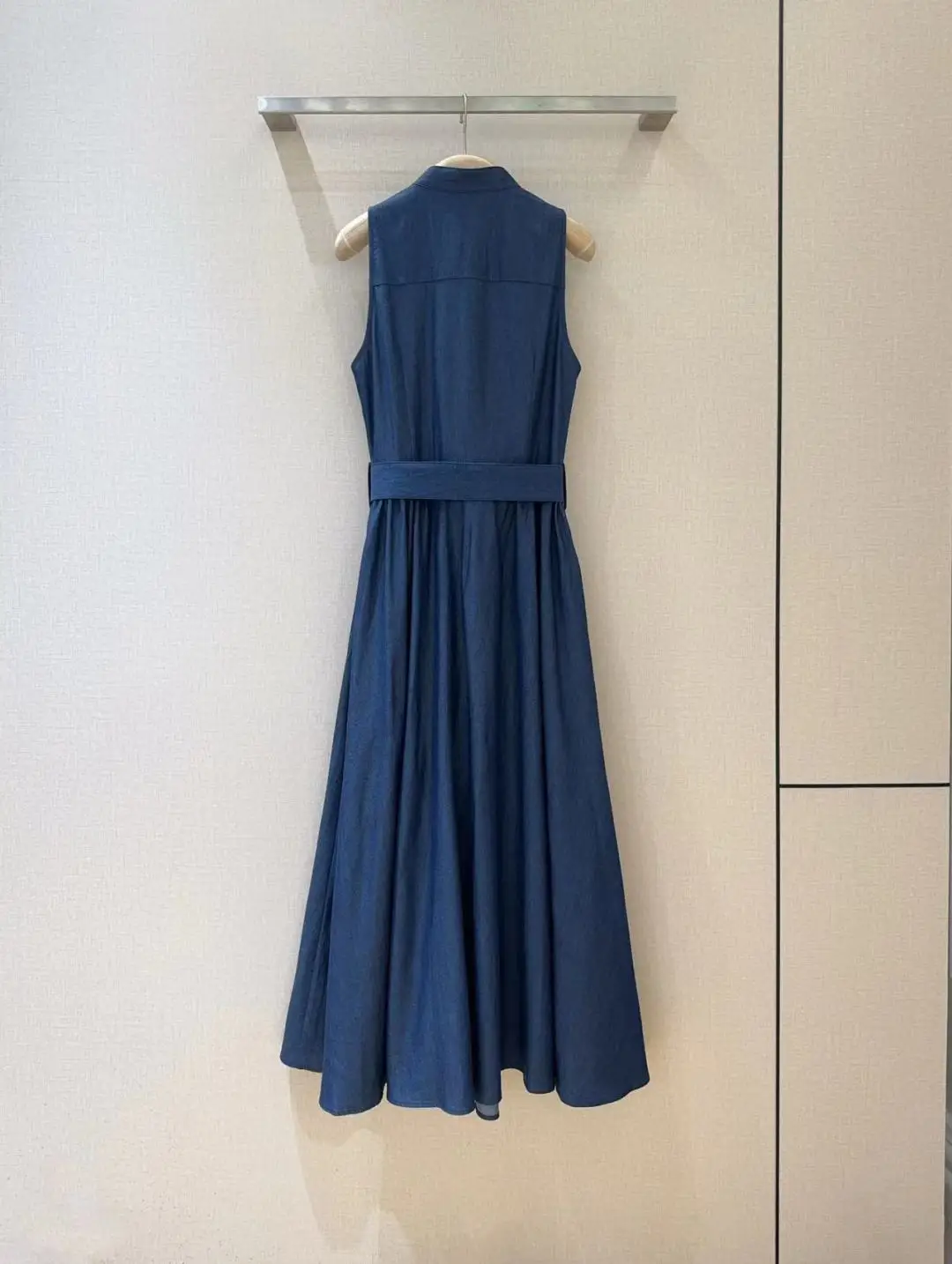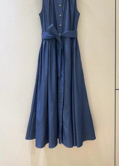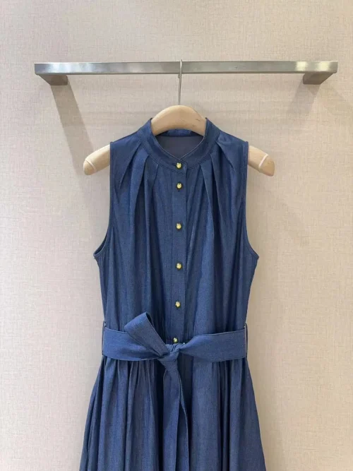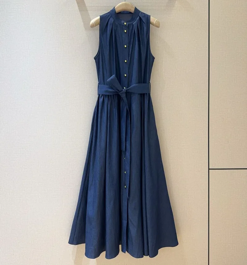 100%Cotton Denim Dress 2025 Summer Style Women Button Front Belt Deco Sleeveless Mid-Calf Length Casual Blue Jeans Dress Vestido