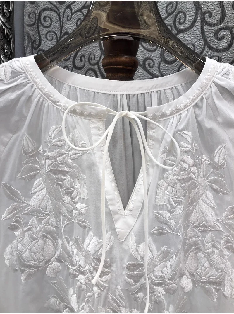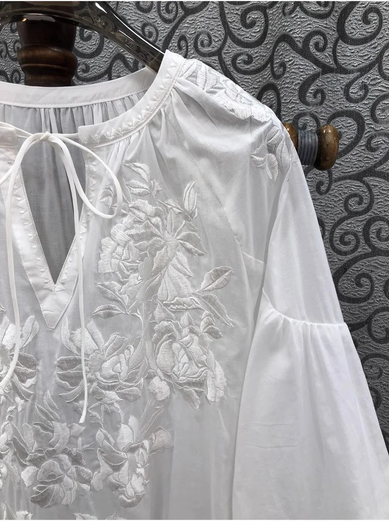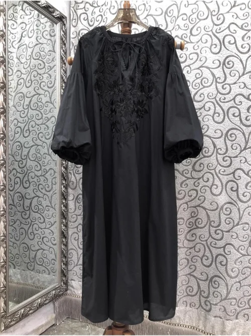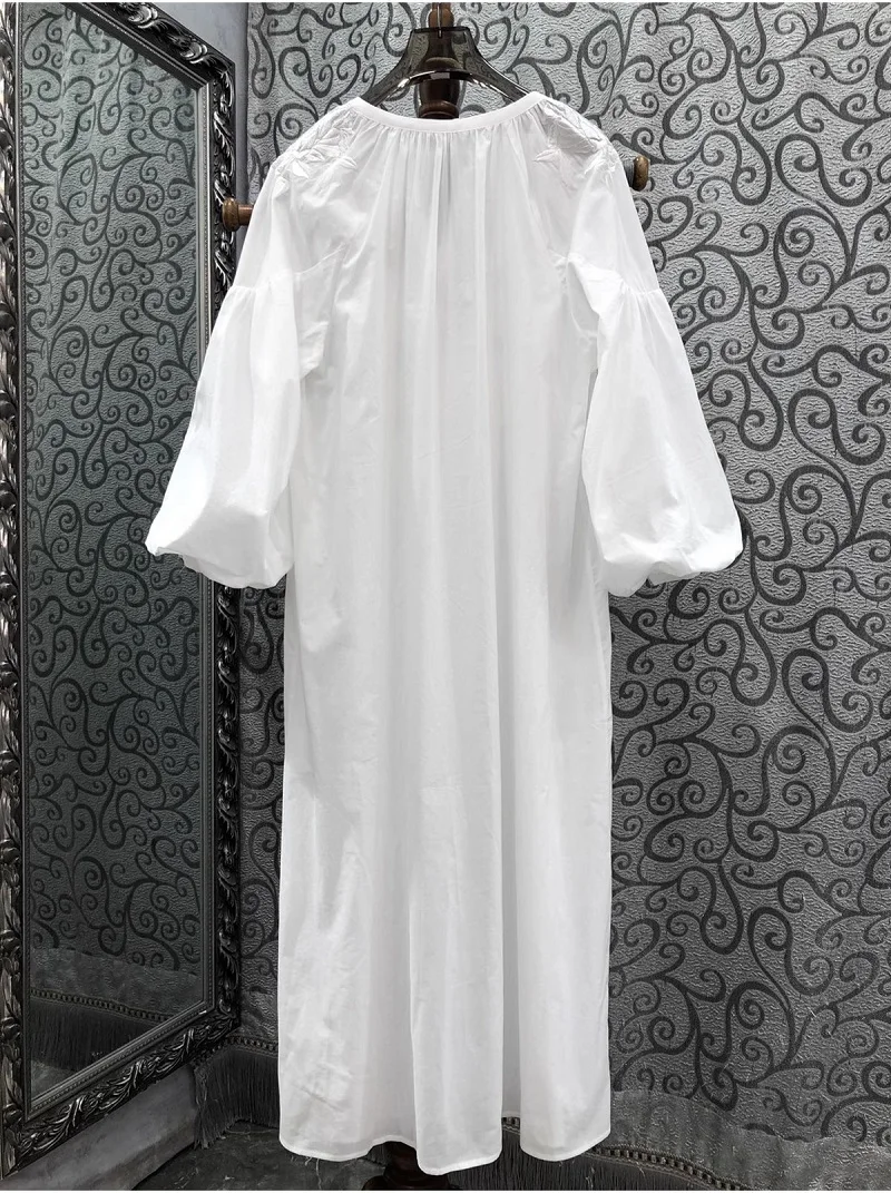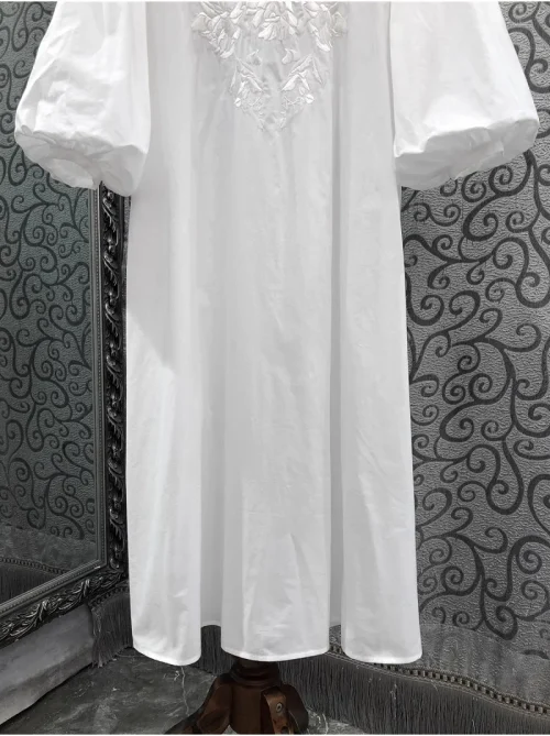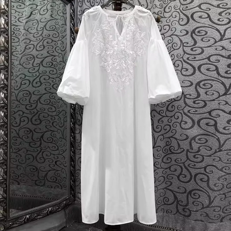 Product Name: 100%Cotton Dress 2024 Summer Fashion Style Women Luxurious Embroidery Lantern Sleeve Mid-Calf Straight White Black Loose Dress