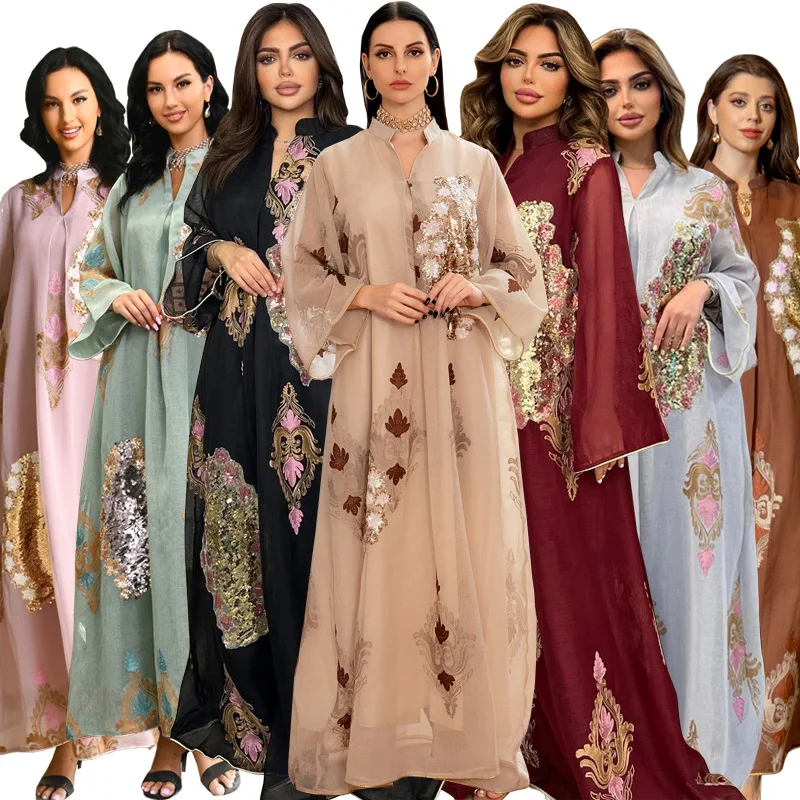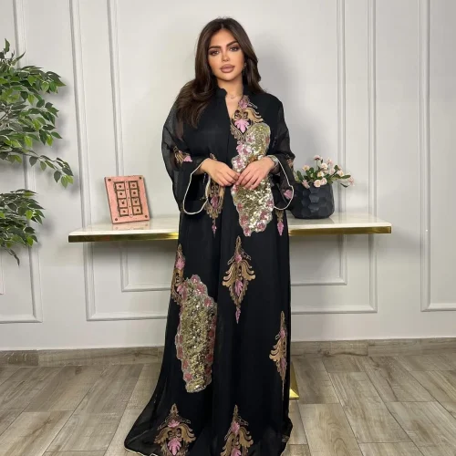 Product Name: 1695 Sequined Floral New Dubai Abaya Muslim Evening Dresses for Women Eid Elegant Kaftan Islamic Ethnic Clothing