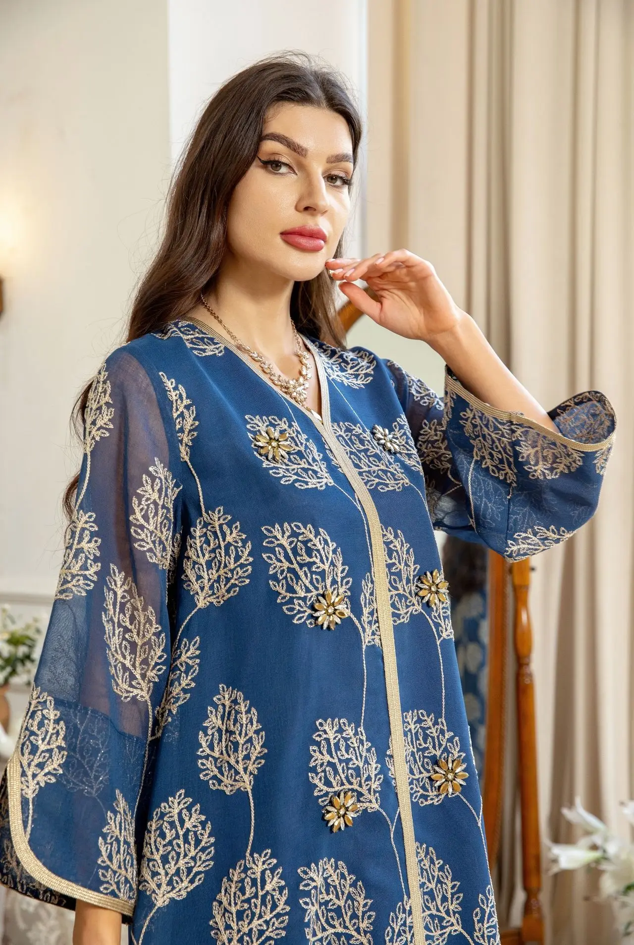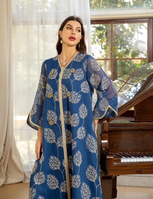 1727 Long Sleeve Maxi Kaftan of Turkey Modern Abaya Dubai Women Traditional Muslim Clothing Islamic Summer Dress