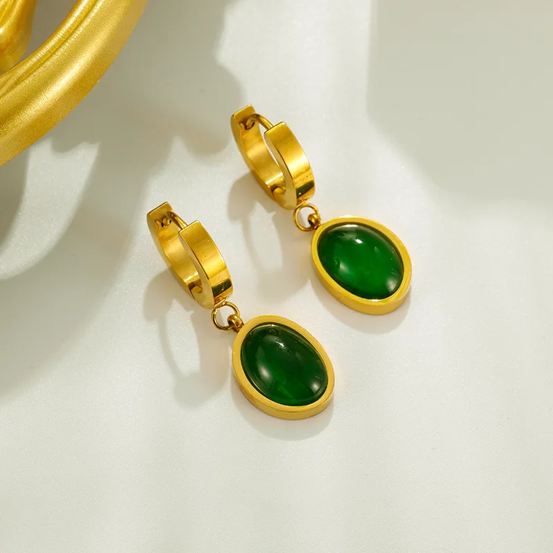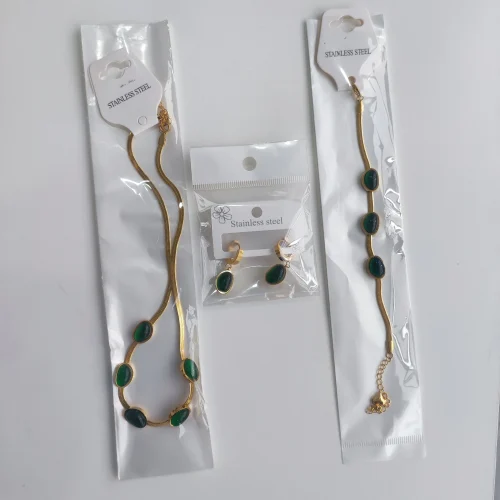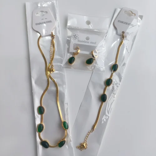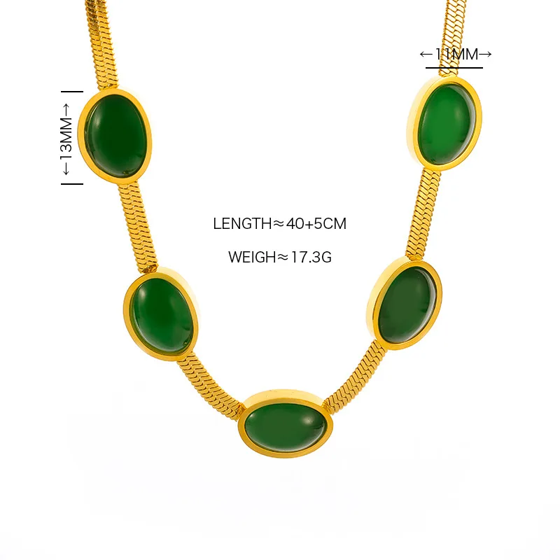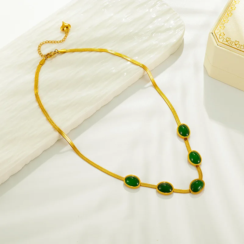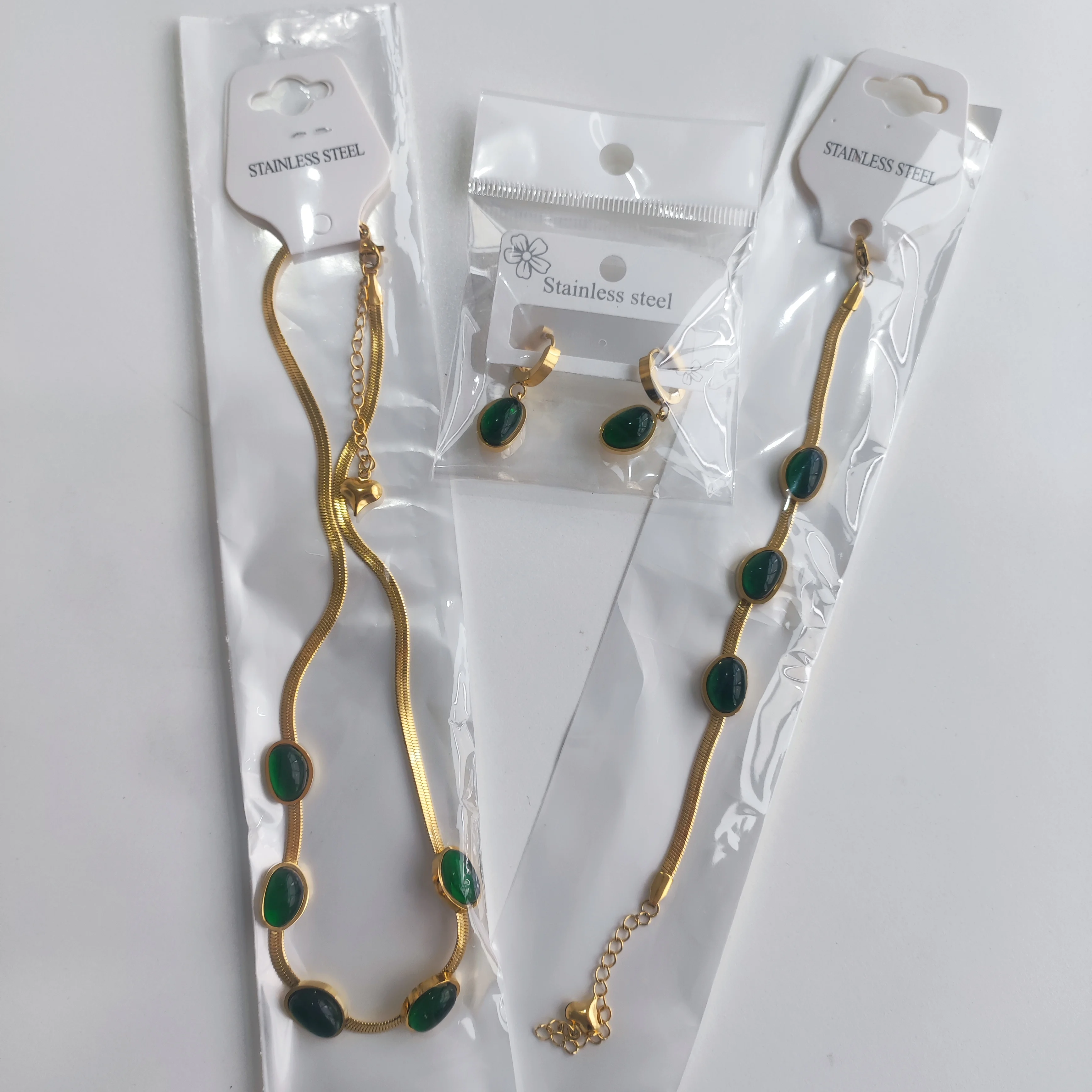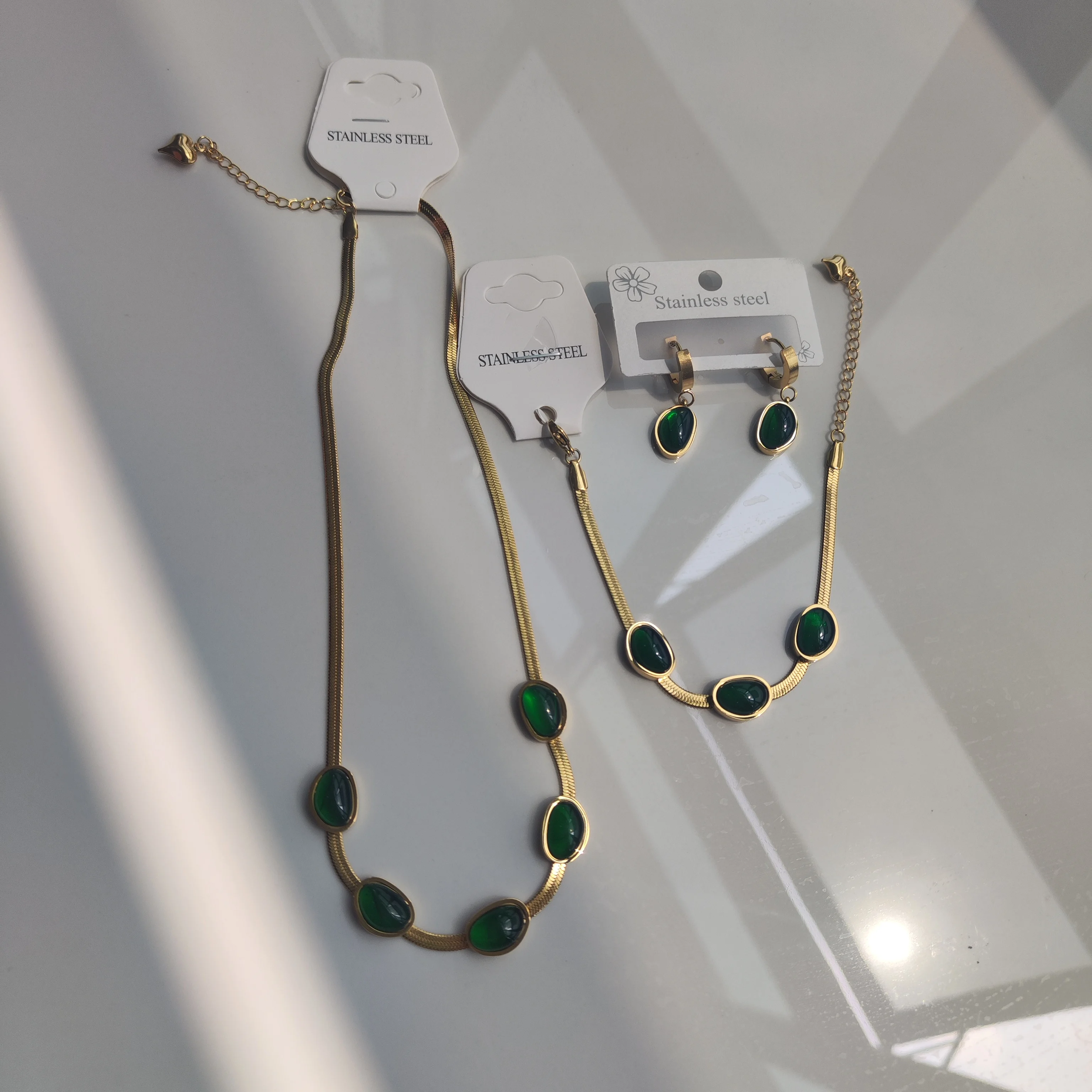 18K Gold Plated Stainless Steel Emerald Jewelry Set Fashion Elegant Emerald Flat Snake Chain Bracelet Earrings Necklace Set