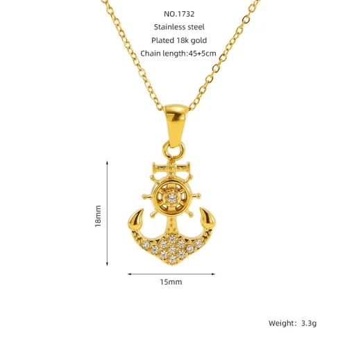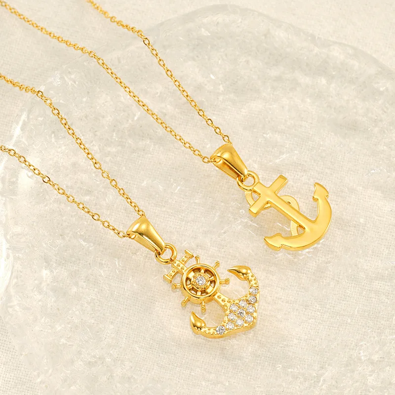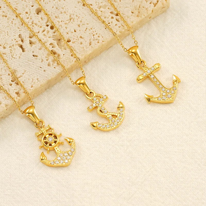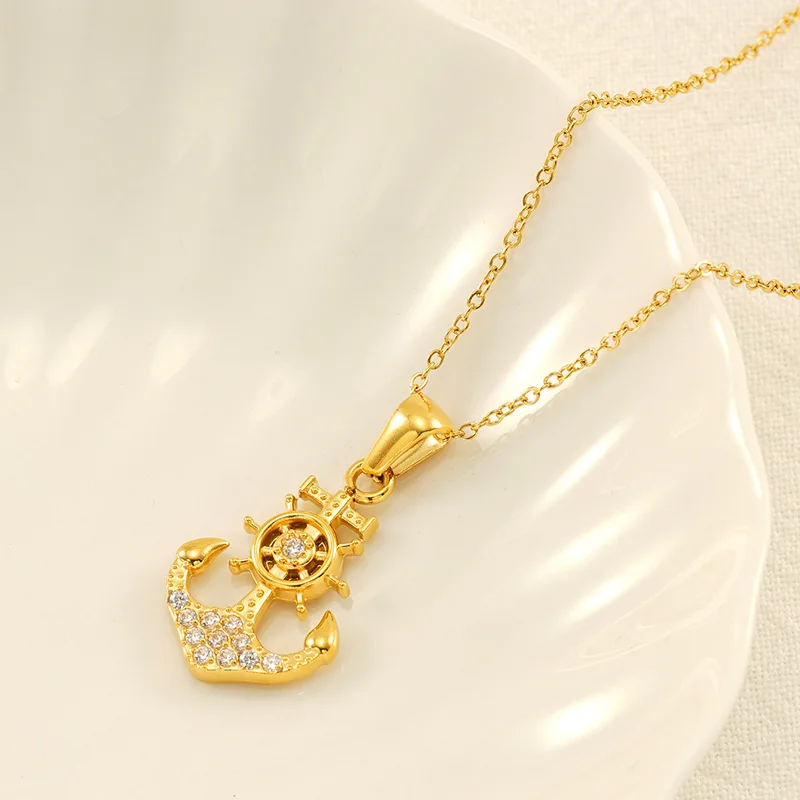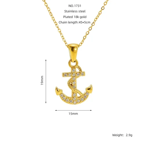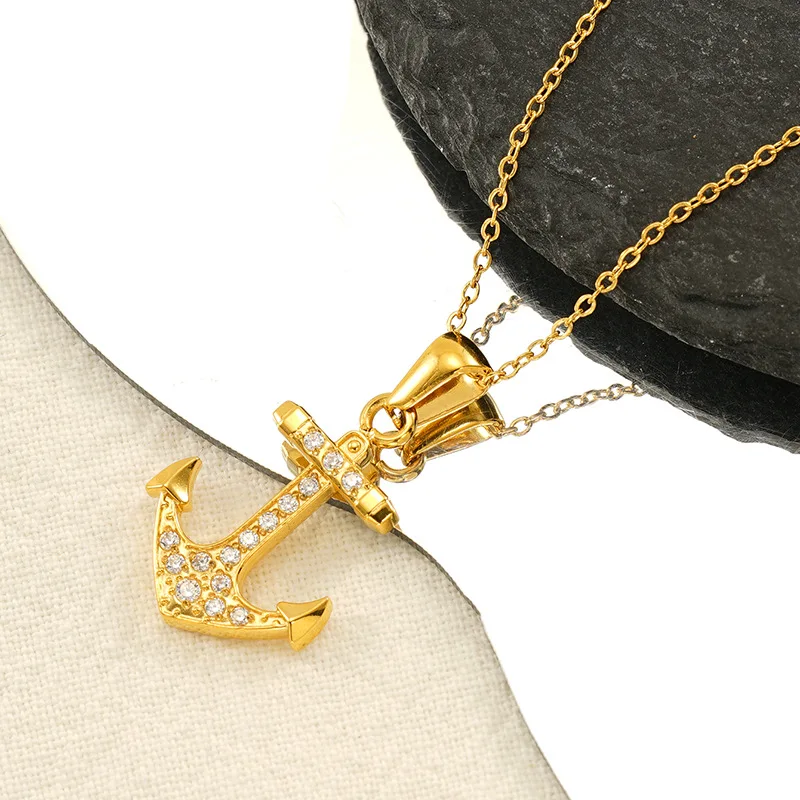 Product Name: 18K Gold Plated Stainless Steel Women Anchor Pendant Necklace with Zircon Microset Luxury Party Jewelry