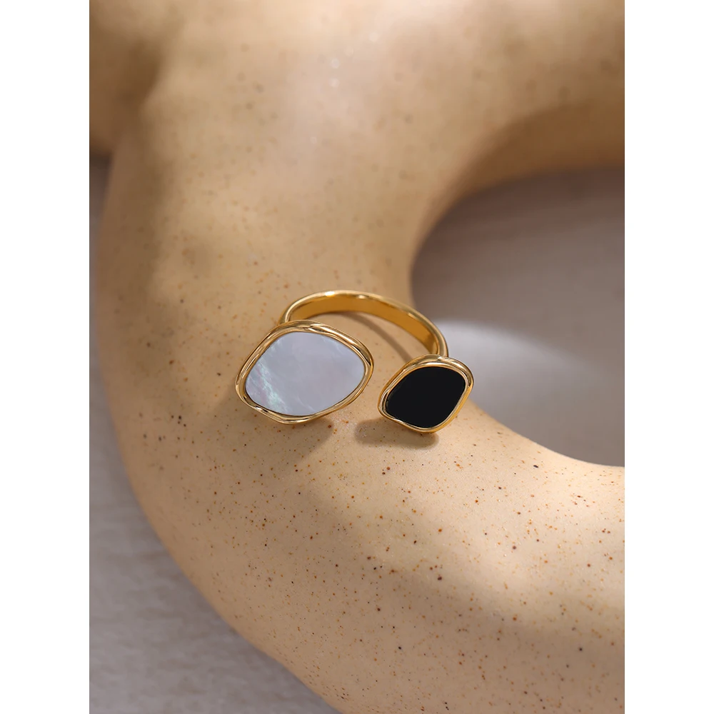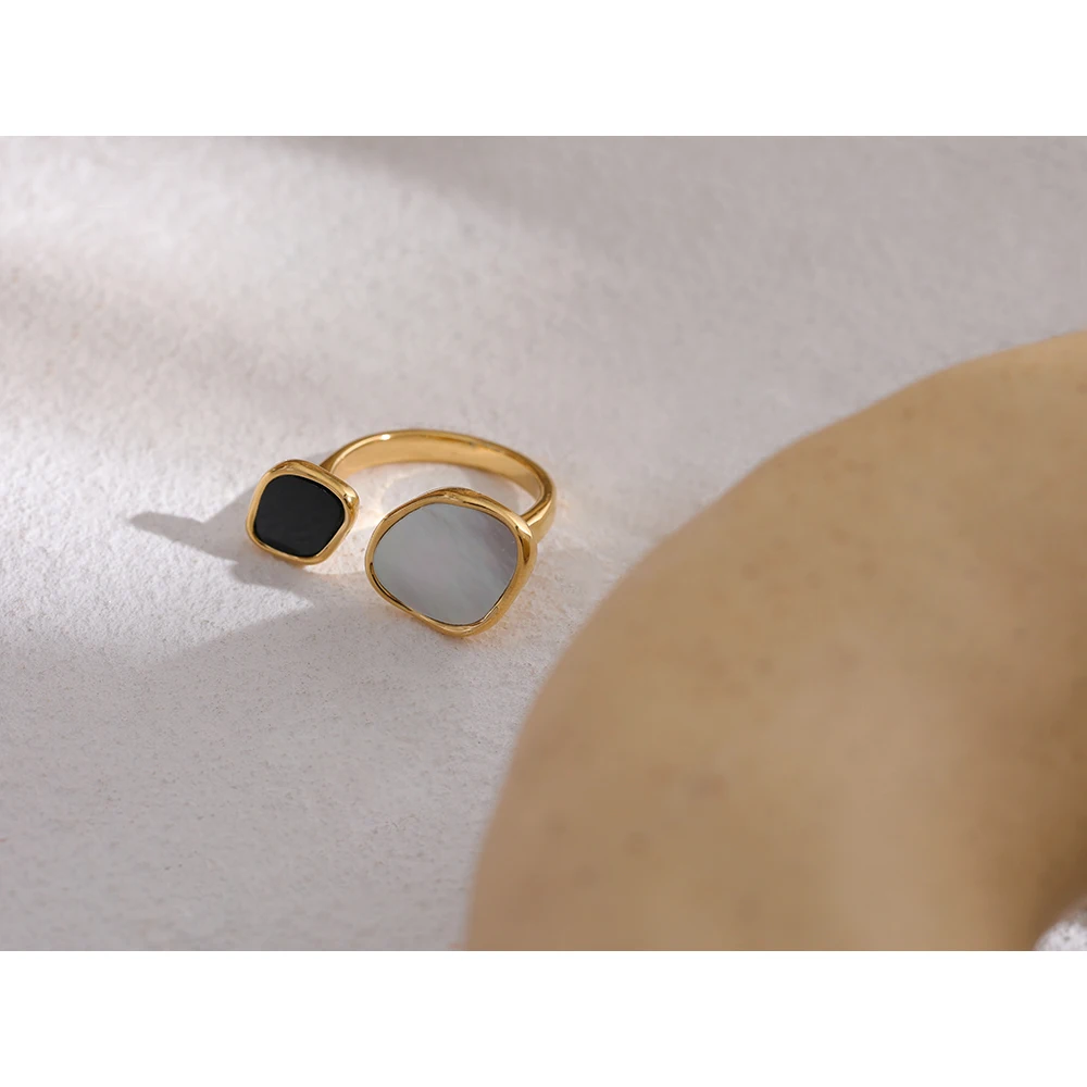 Product Name: 1986 Statement Stainless Steel Black Acrylic White Shell Chic Fashion Trending Ring Jewelry for Women