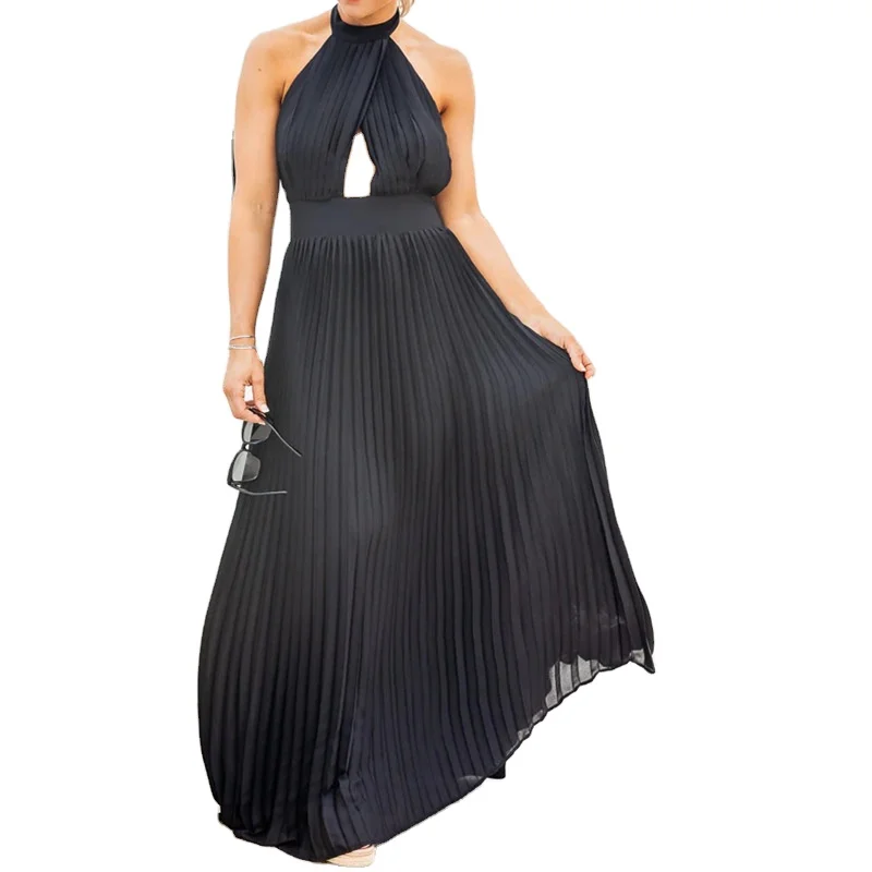2022 Summer New Halter Neck Pleated Long Dress High Waist Backless Large Swing for Women Beach Casual Street Wear Dress