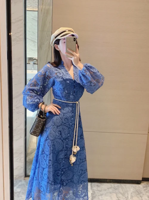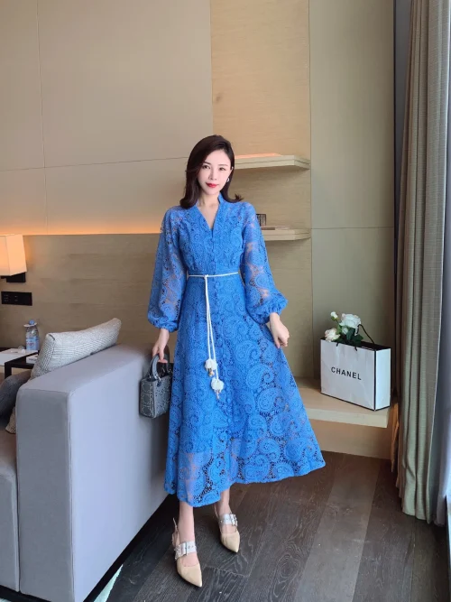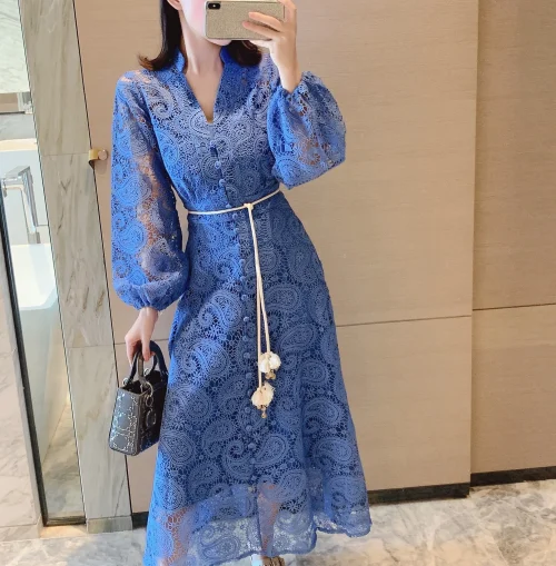Product Name: 2022 Women Long Lace Hollow-out Lantern Sleeve Dress With Belt Dresses for Women