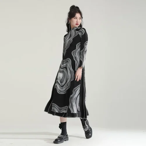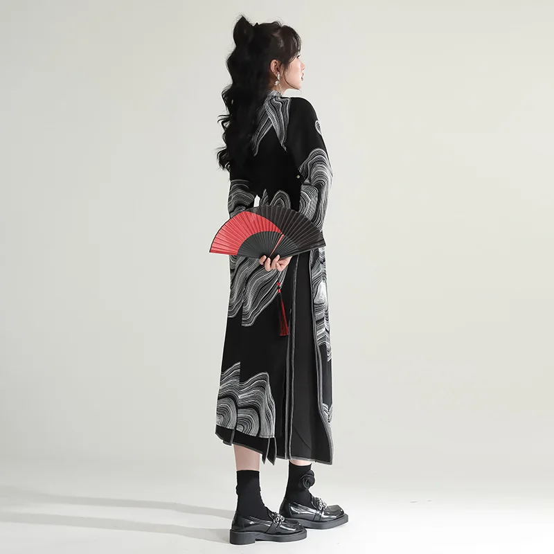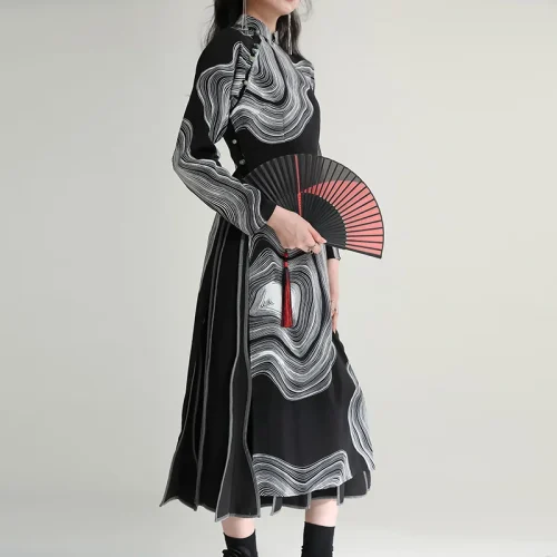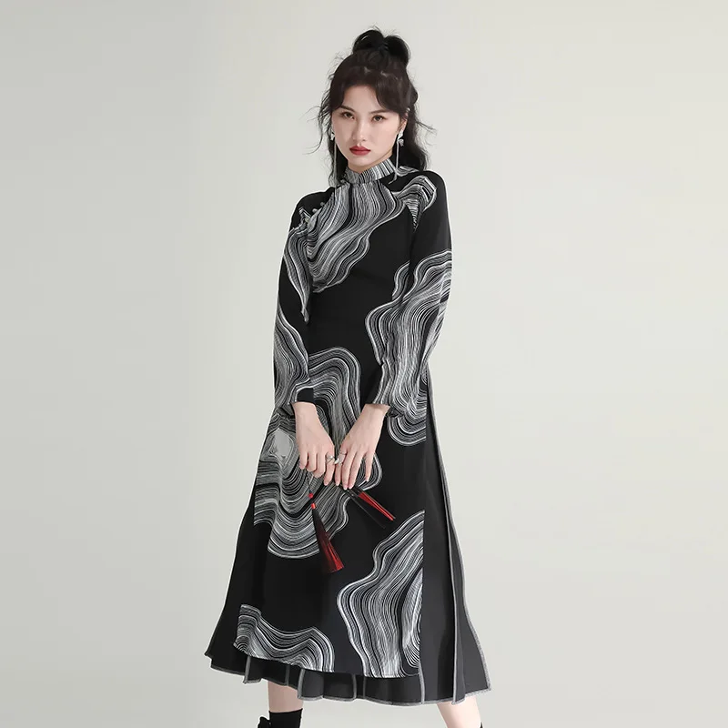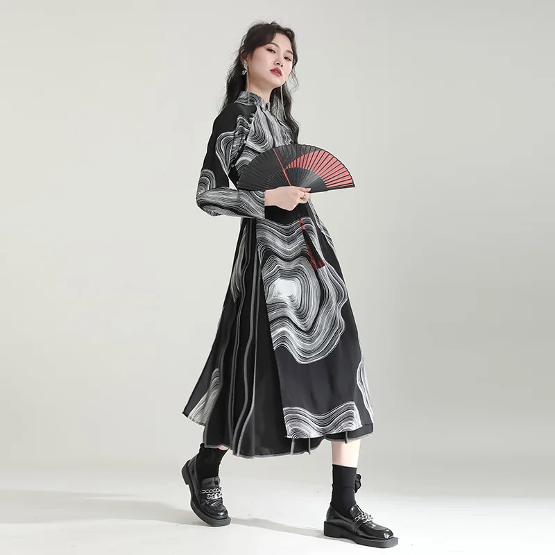 Product Name: 2023 Autumn High Slit Long Sleeve Dress for Women Retro New Chinese Improved Version of Disc Buckle Medium Length Black Dress