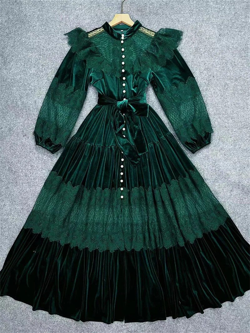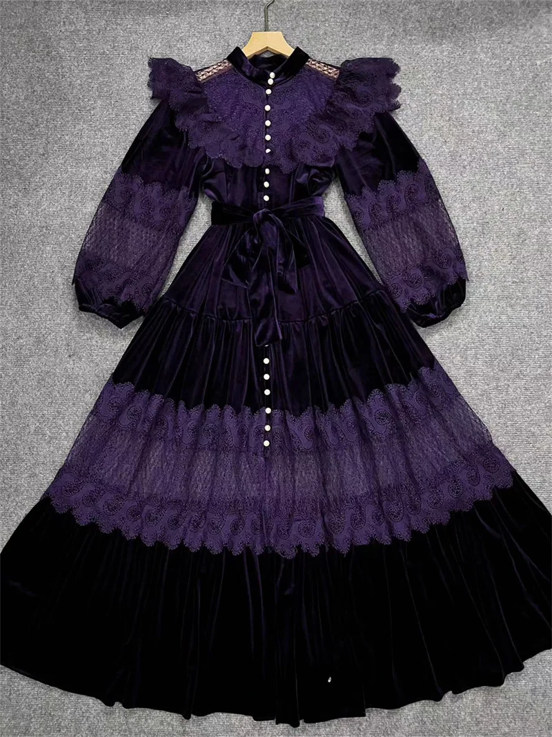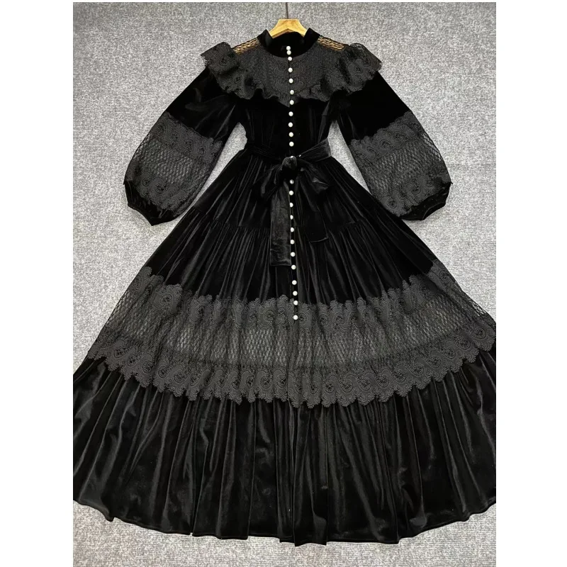 2023 New Fashion Long Sleeve Velvet Lace Dress With Large Skirt and Decorate With Pearl Elegant Maxi Long Sleeves Dress