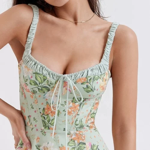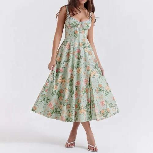 2023 Women Clothing Floral Print Light Jade Bustier Sundress With Puff Sleeves Casual Summer Ladies Sexy Slit Midi Dress