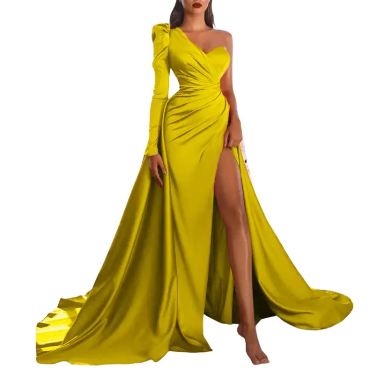 Product Name: 2024 Luxury One Shoulder Satin Silk Party High Slit Long Sleeve Prom Dresses Party Evening Dress Gowns Sexy Gowns for Women